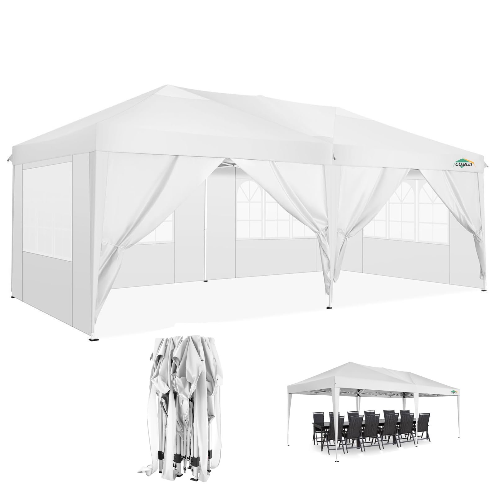【 3 Height Adjustable】 COBIZI 10x20FT Pop-up Canopy Tent can be adjusted to 77 inch, 79 inch, 81 inch. Grand gazebo provides 18 Square meter space accommodates 15+ people, big enough to shade a picnic table. Suitable for wedding, party, family gathering.