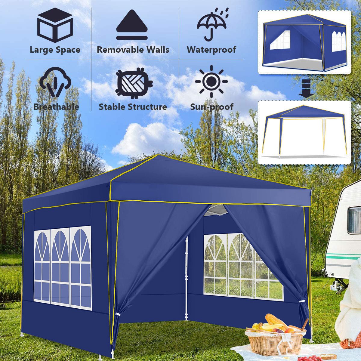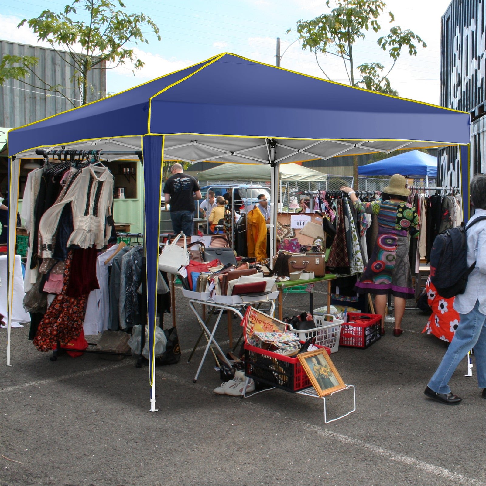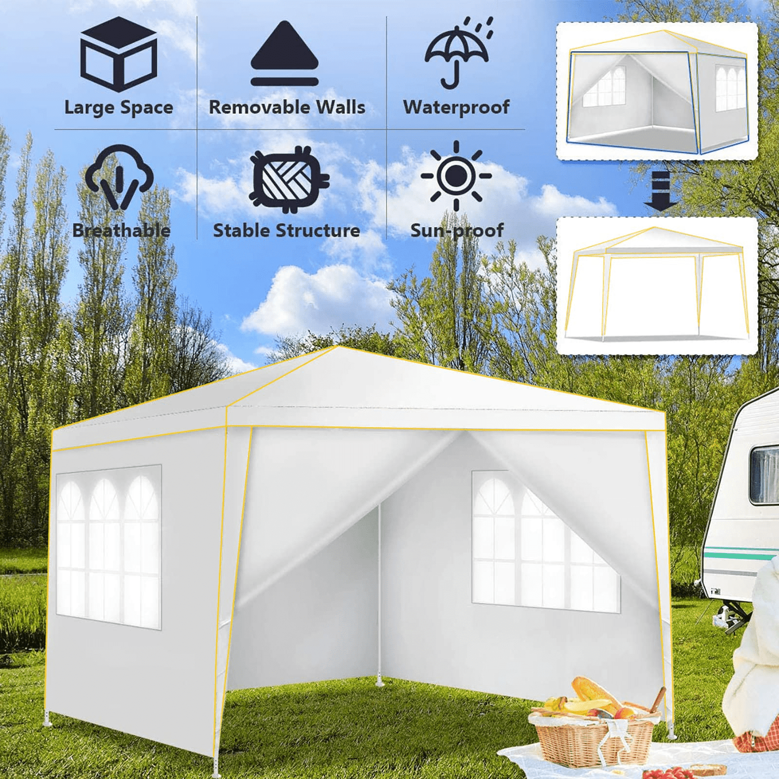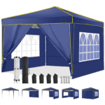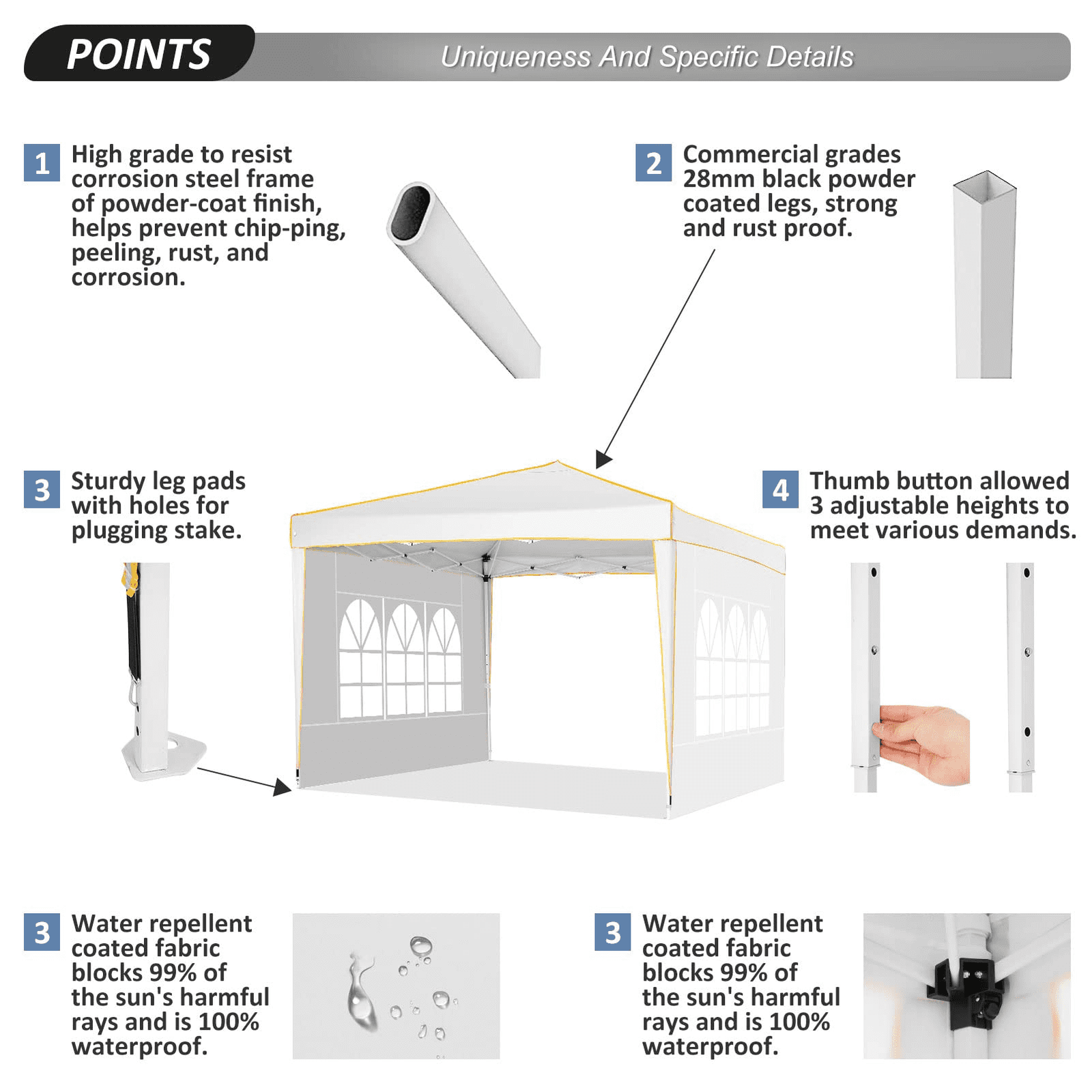 【Sturdy Frame & Upgraded Durable Fabric】This pop up canopy made of thick steel frame with anti-rust powder coating with full truss structure. The canopy top is made of 210D oxford fabric with premium UV coating, standard UPF 50+ that blocks out 99% harmful UV. Waterproof. Improve the comfort level of your backyard or patio.