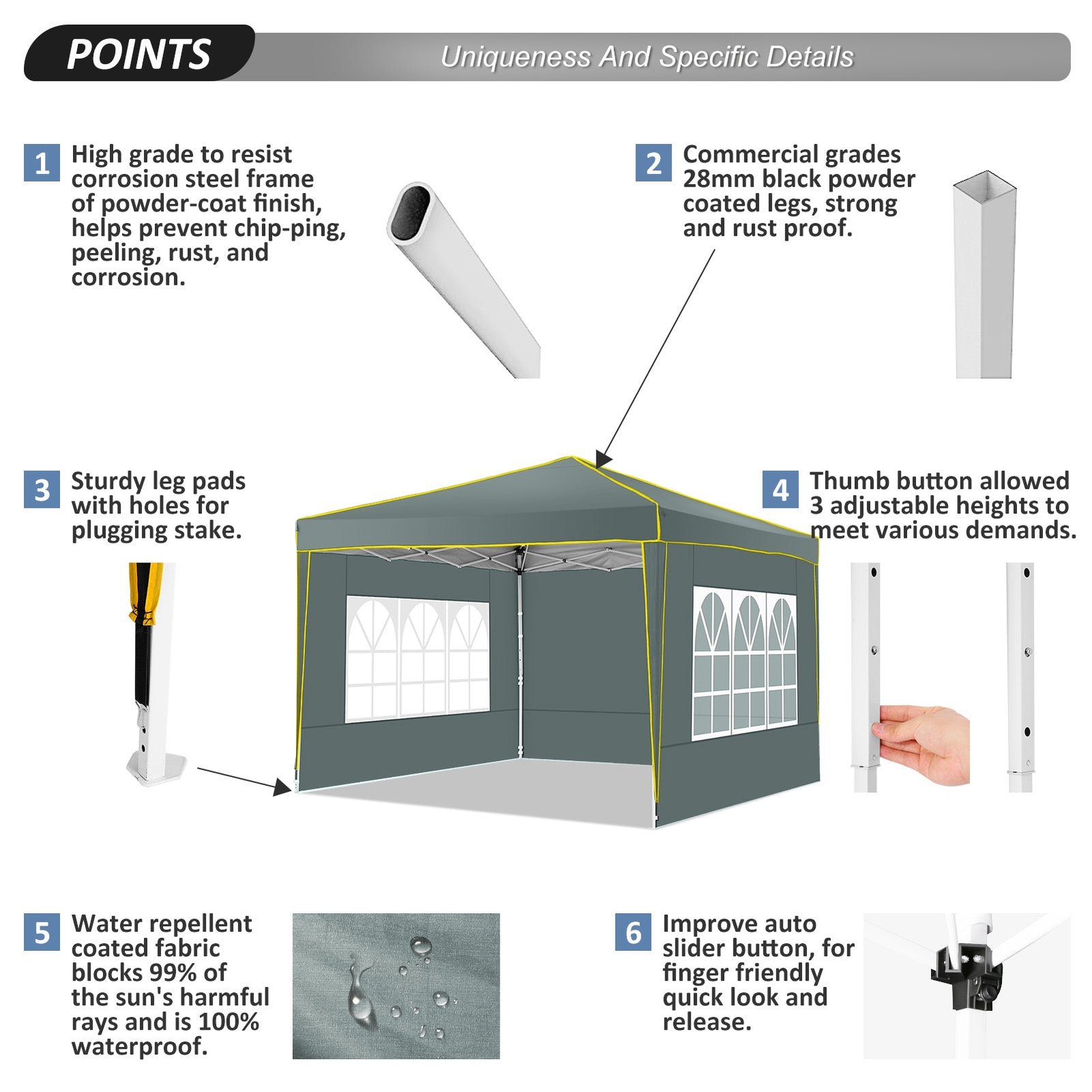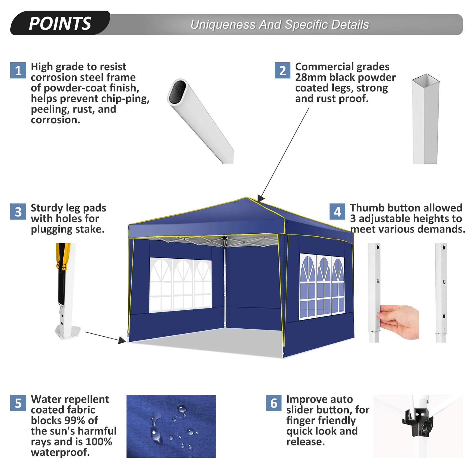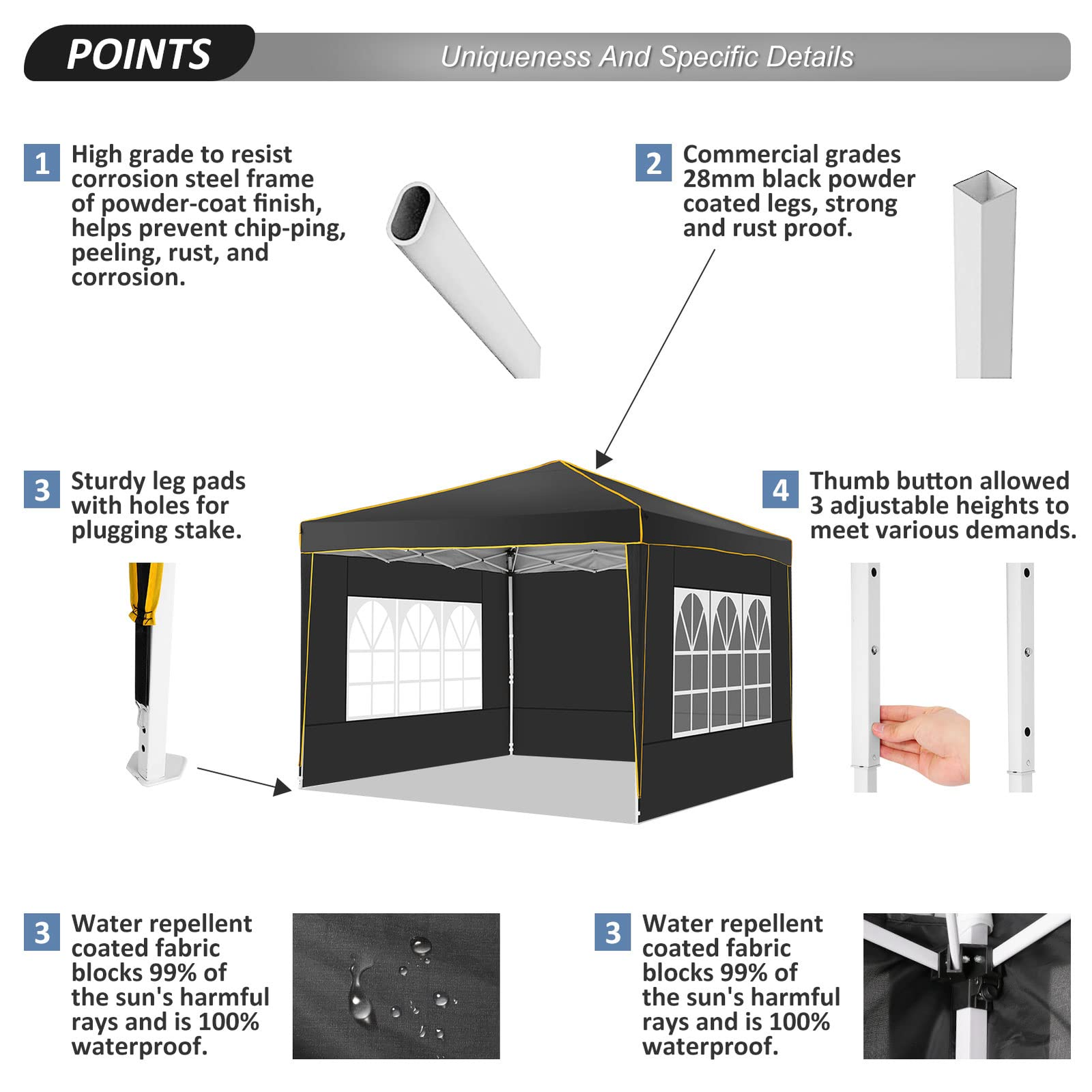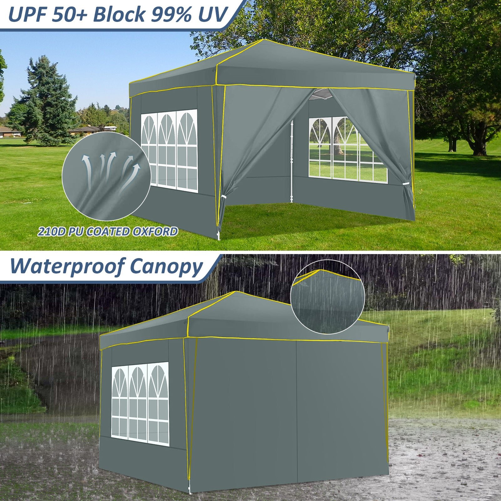【Sturdy Frame & Upgraded Durable Fabric】This pop up canopy made of thick steel frame with anti-rust powder coating with full truss structure. The canopy top is made of 210D oxford fabric with premium UV coating, standard UPF 50+ that blocks out 99% harmful UV. Waterproof. Improve the comfort level of your backyard or patio.