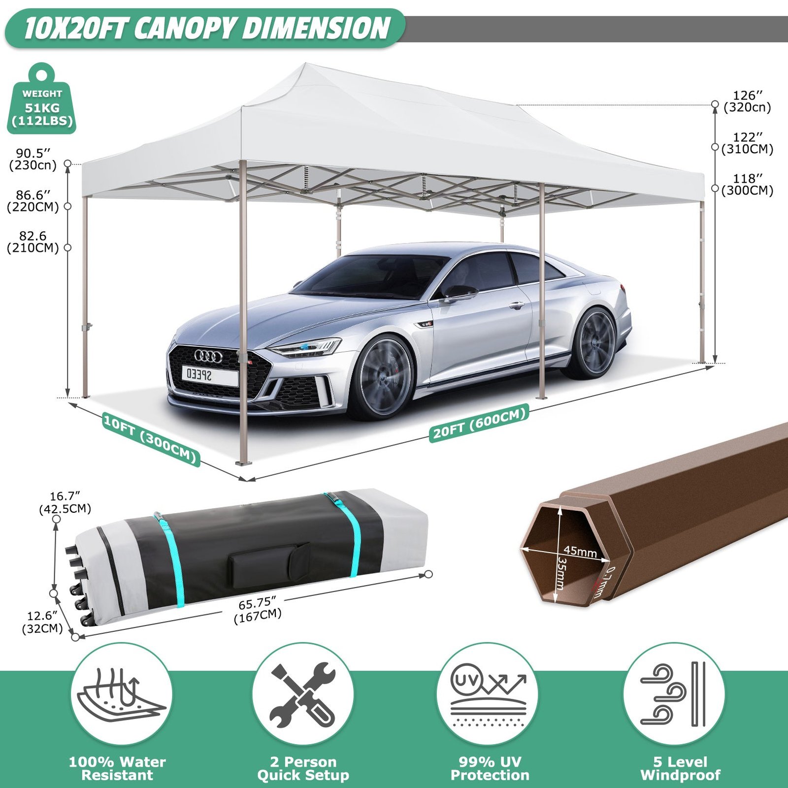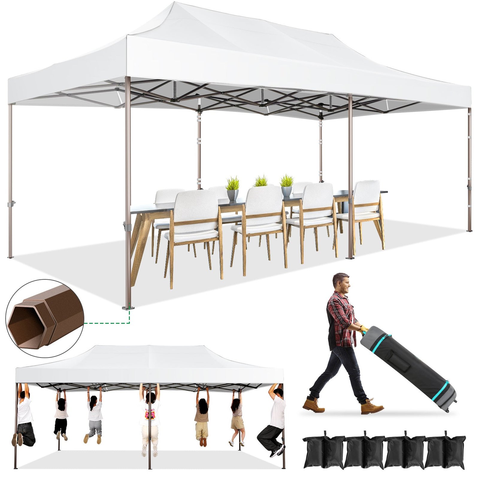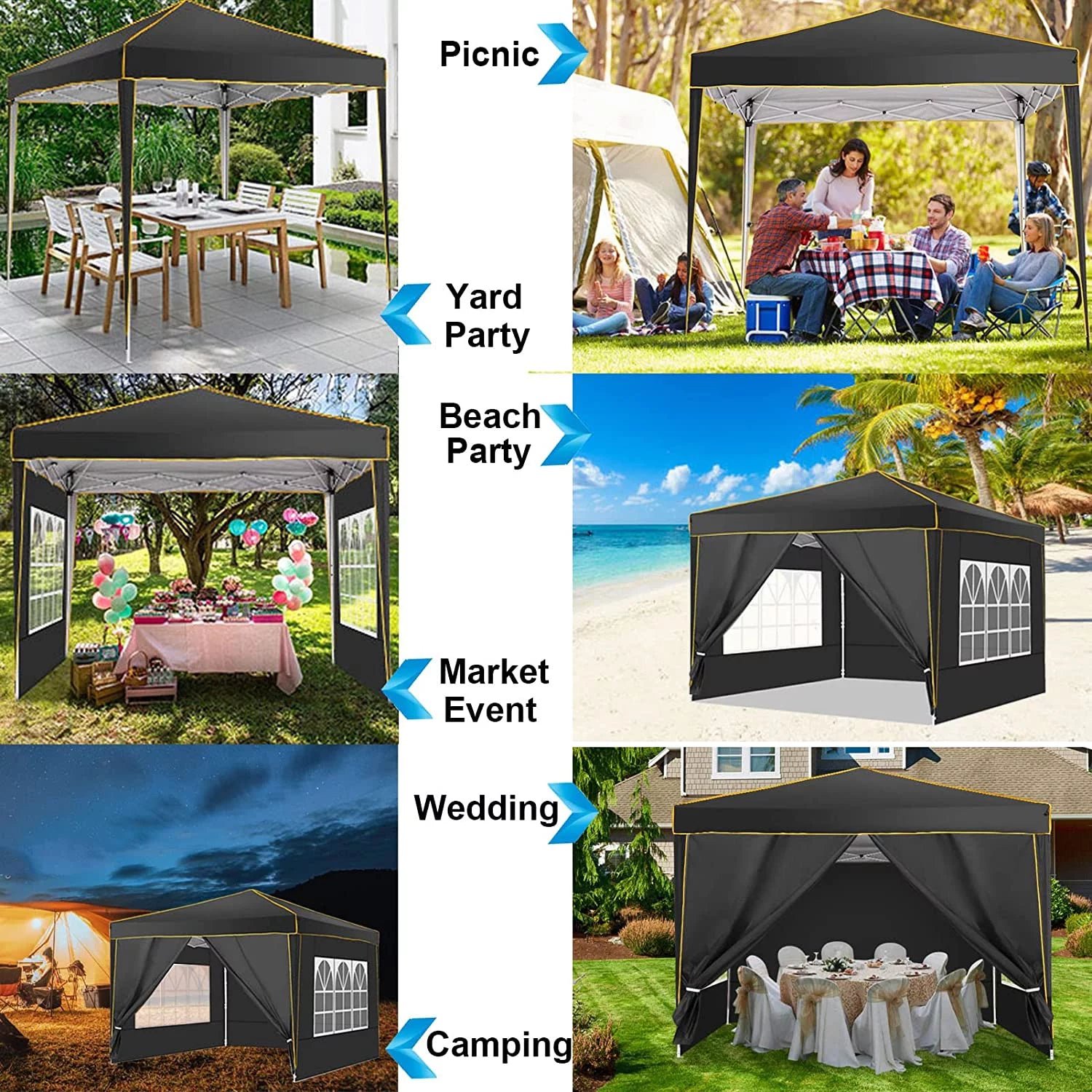 【Sturdy Frame & Upgraded Durable Fabric】This pop up canopy made of thick steel frame with anti-rust powder coating with full truss structure. The canopy top is made of 210D oxford fabric with premium UV coating, standard UPF 50+ that blocks out 99% harmful UV. Waterproof. Improve the comfort level of your backyard or patio.