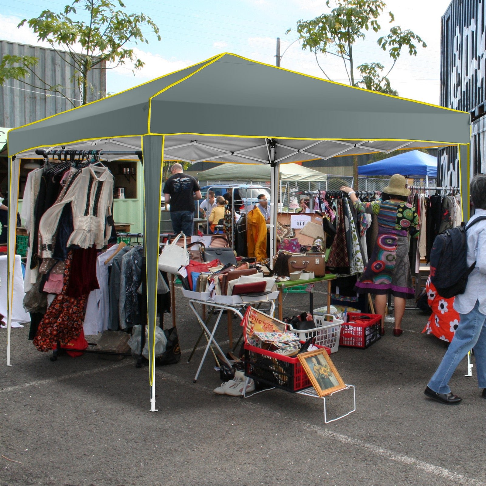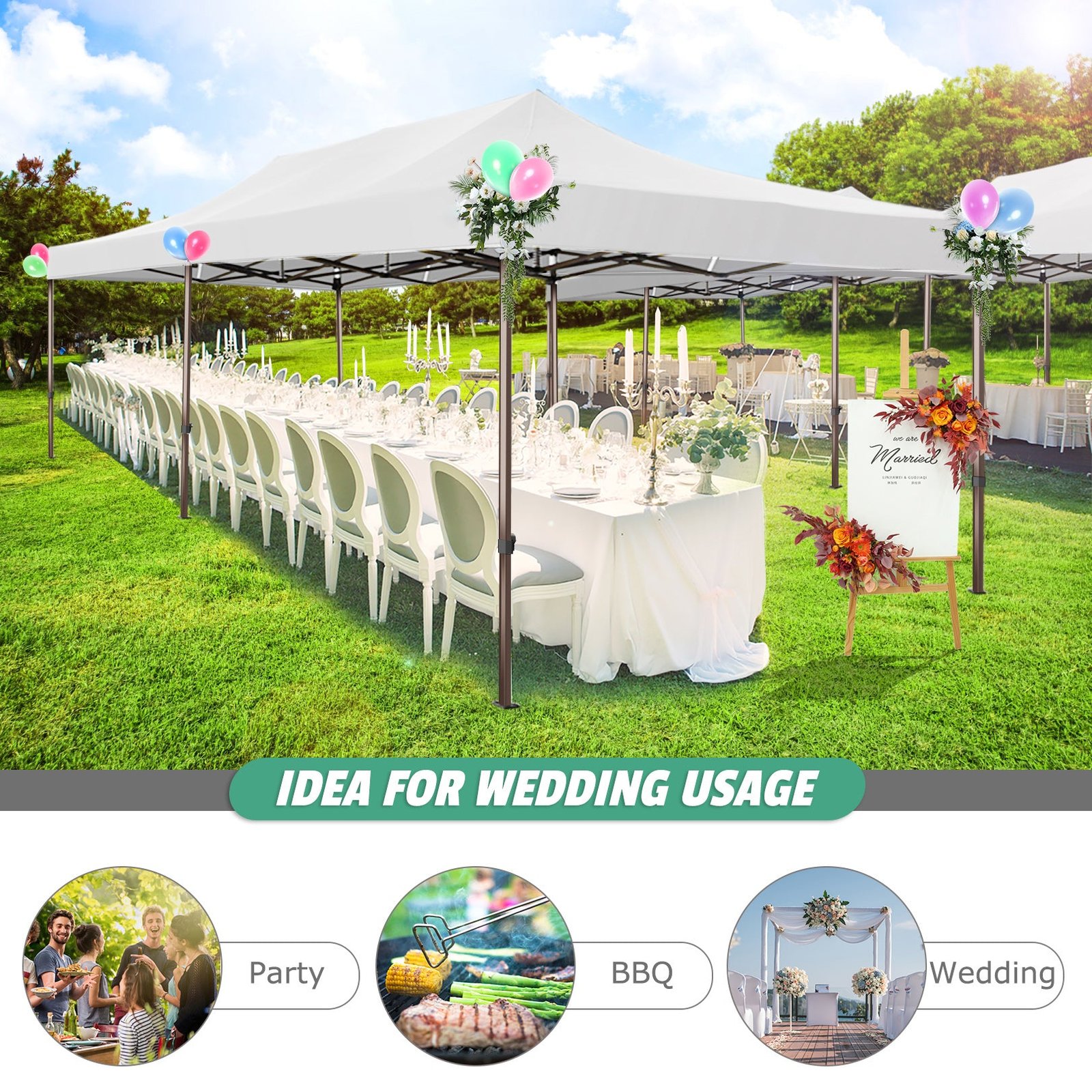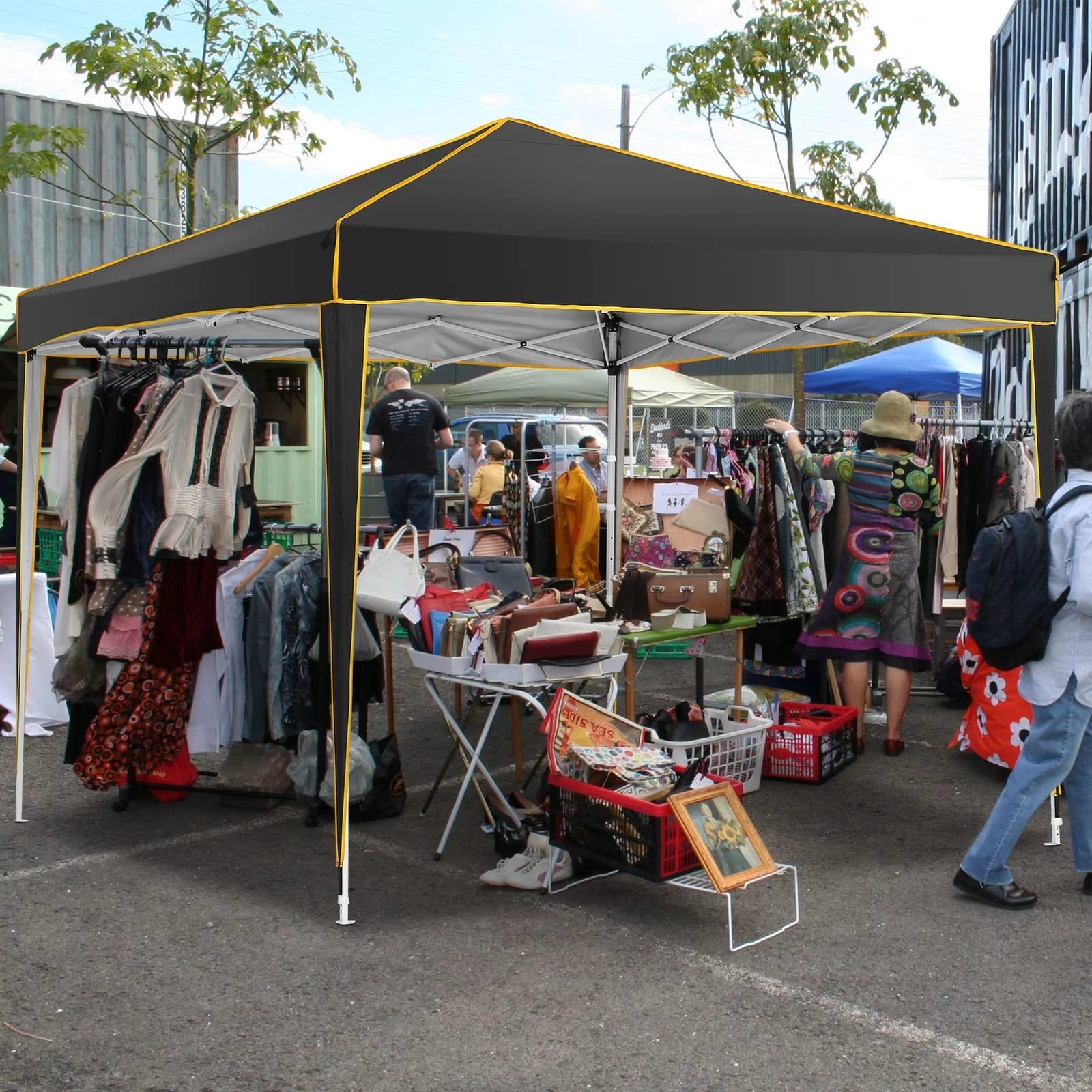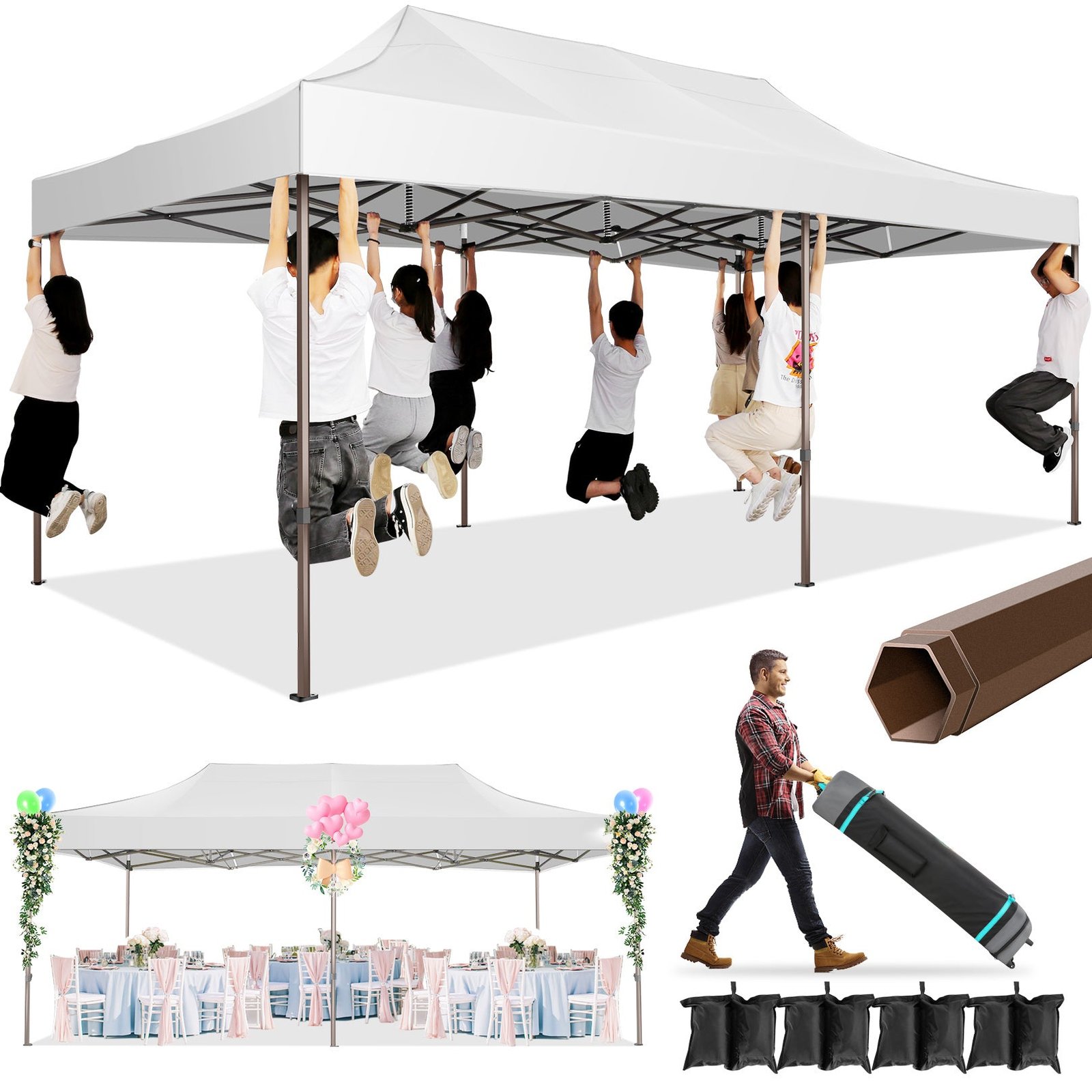 【Sturdy Frame & Upgraded Durable Fabric】This pop up canopy made of thick steel frame with anti-rust powder coating with full truss structure. The canopy top is made of 210D oxford fabric with premium UV coating, standard UPF 50+ that blocks out 99% harmful UV. Waterproof. Improve the comfort level of your backyard or patio.
