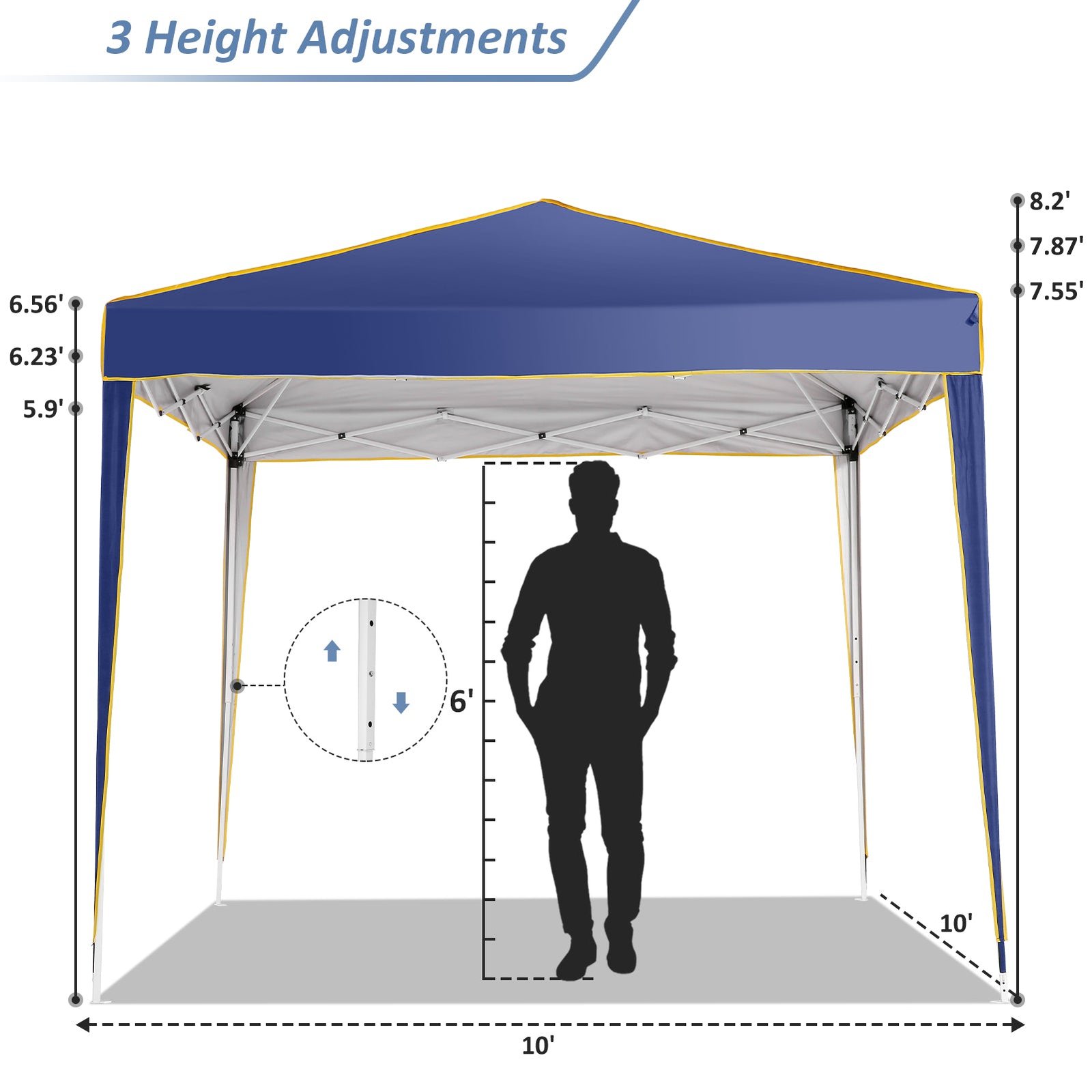 【Upgraded 3-Height Settings】Three different height settings allow you to choose the height that meets your needs. With High, Medium or Low height setting: 97.2″-100.8″-104.4″. Straight leg design provide 100 square feet of shadow area. Perfect for outdoor event shelter or commercial activities in farmers market, backyard,camping, wedding, festivals, beach, sports events, family parties, BBQ.