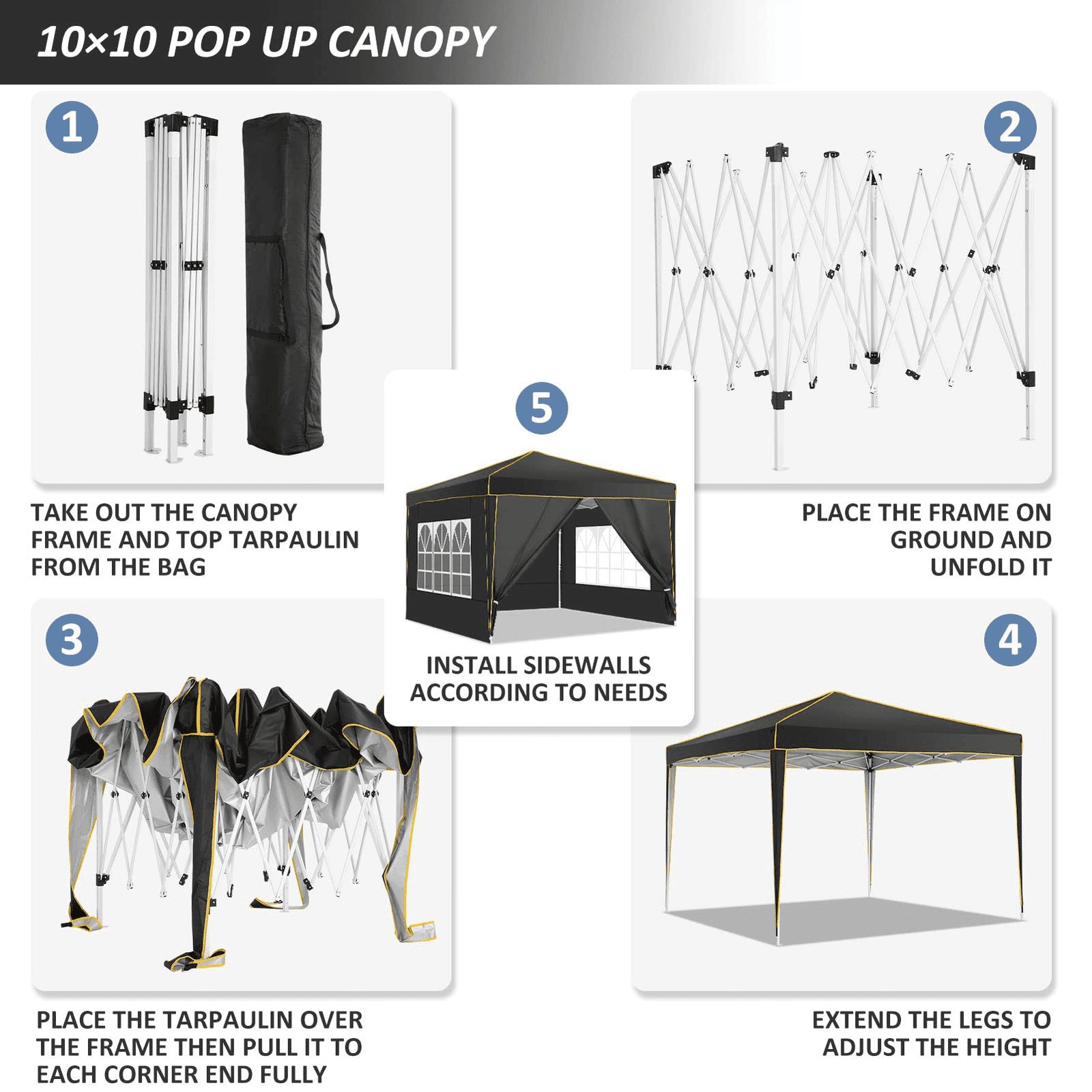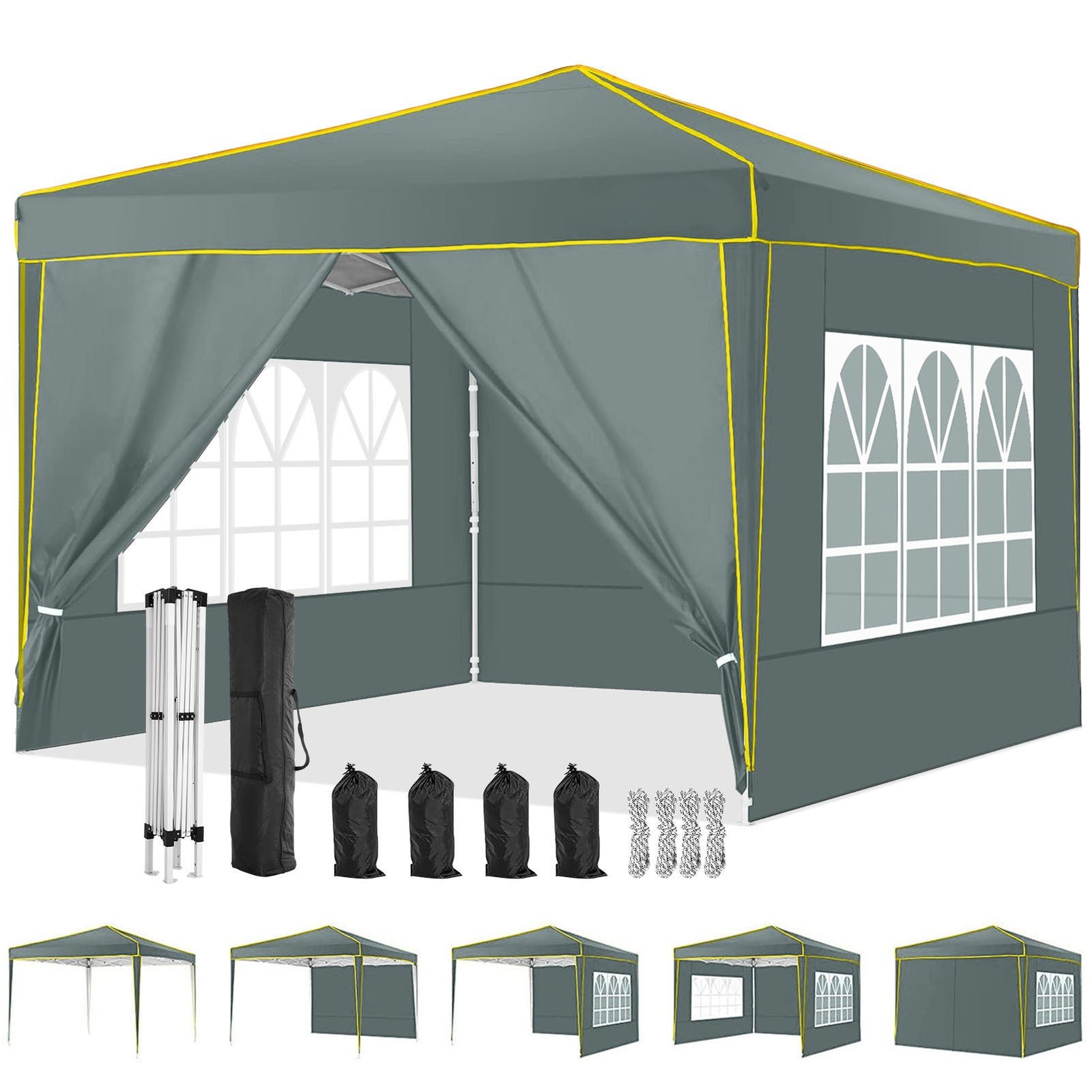 【Package Includes and Service】:10 x 10 pop up canopy tent + 4 sidewalls + 1x bag + 4x Stakes + 4x ropes+ 4x sandbags. If you have any questions, please contact us.