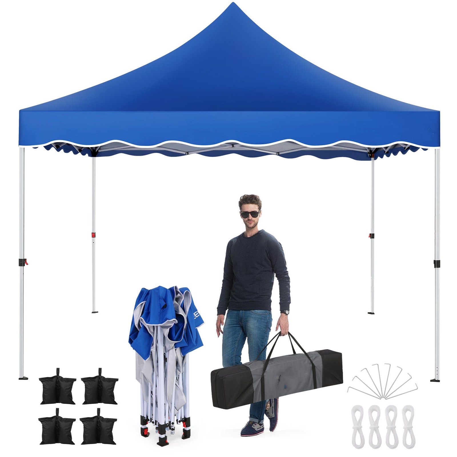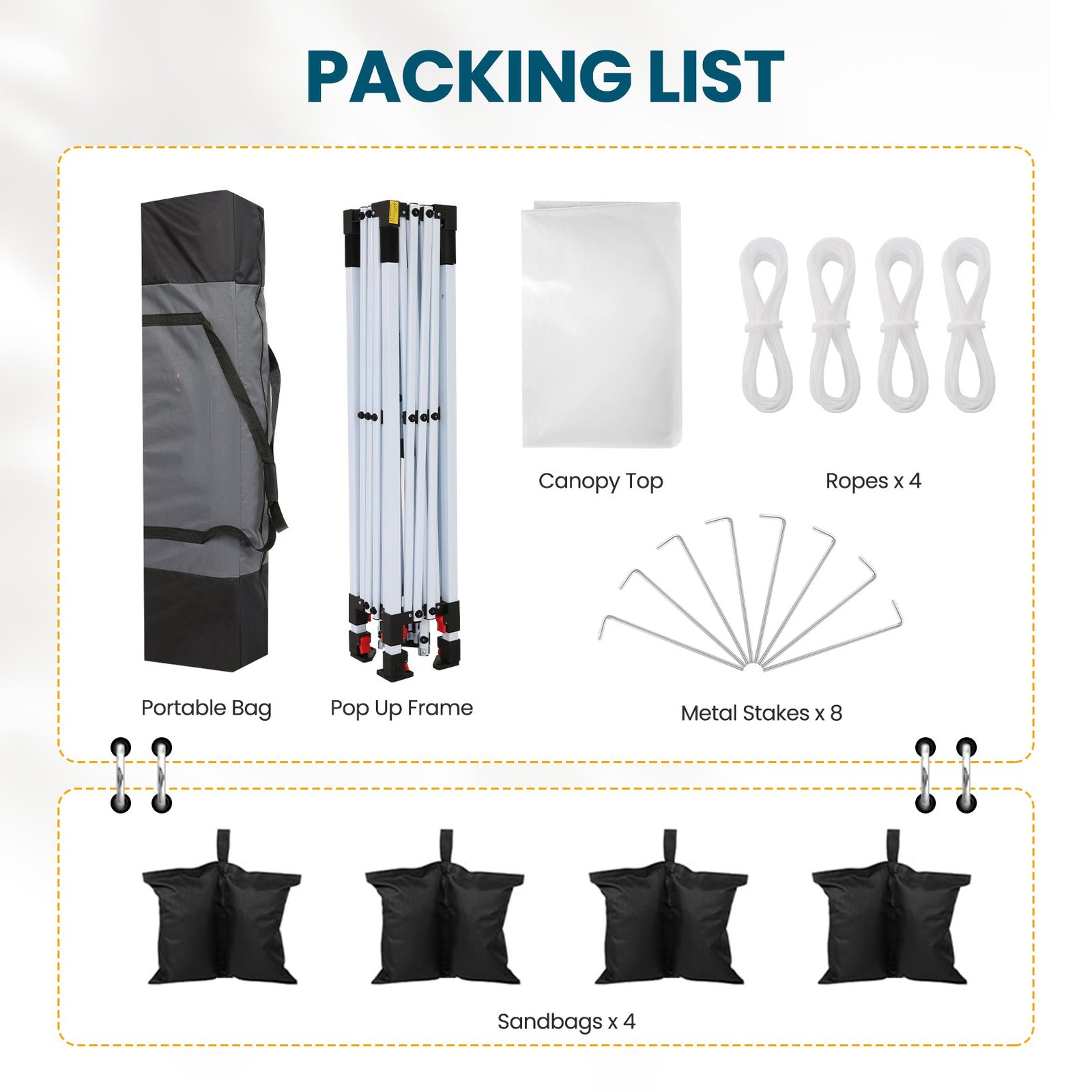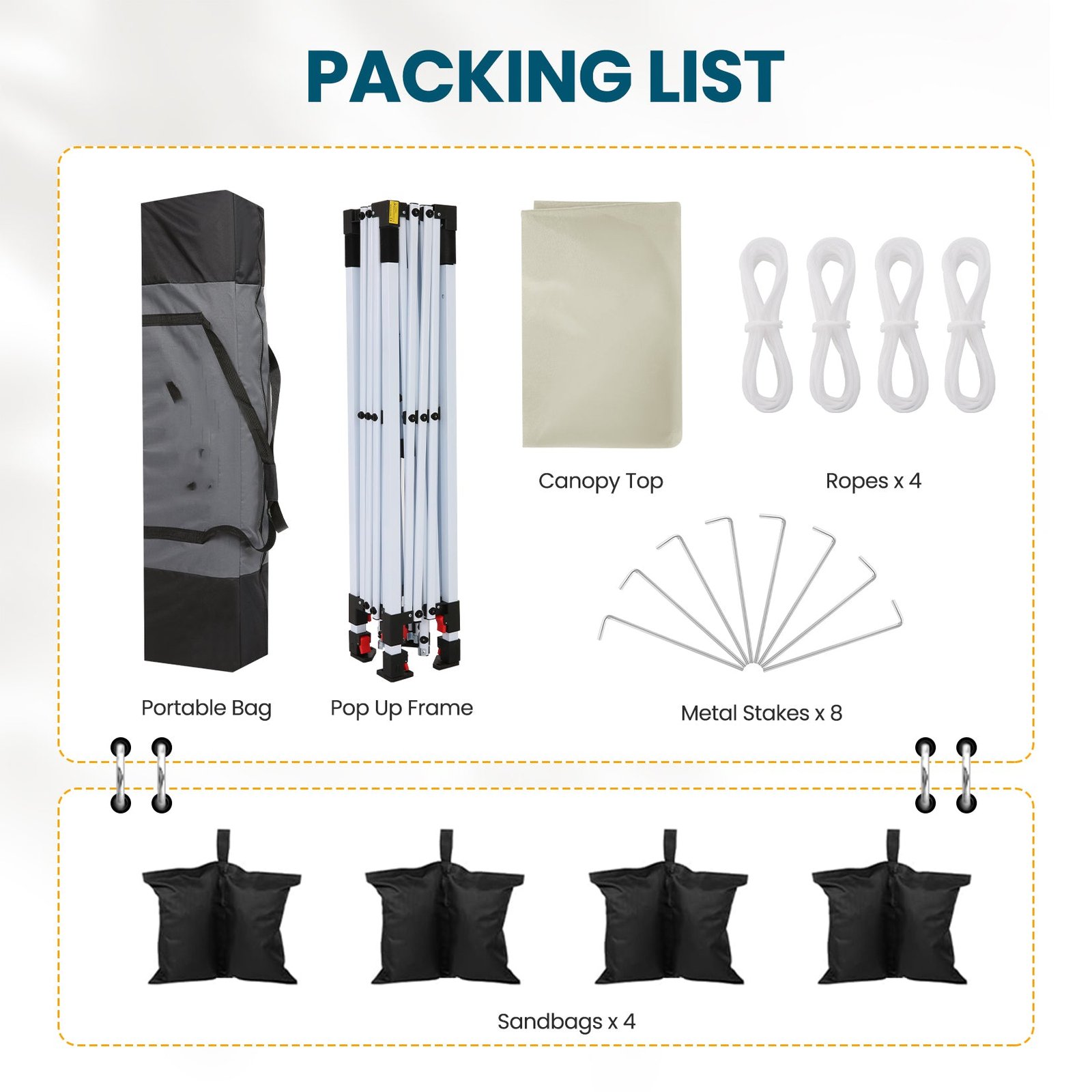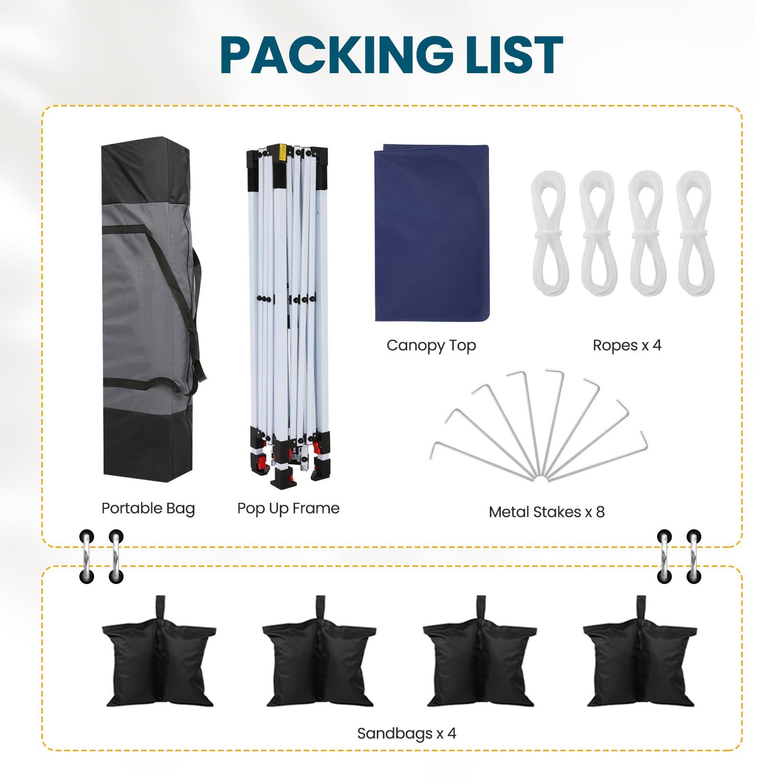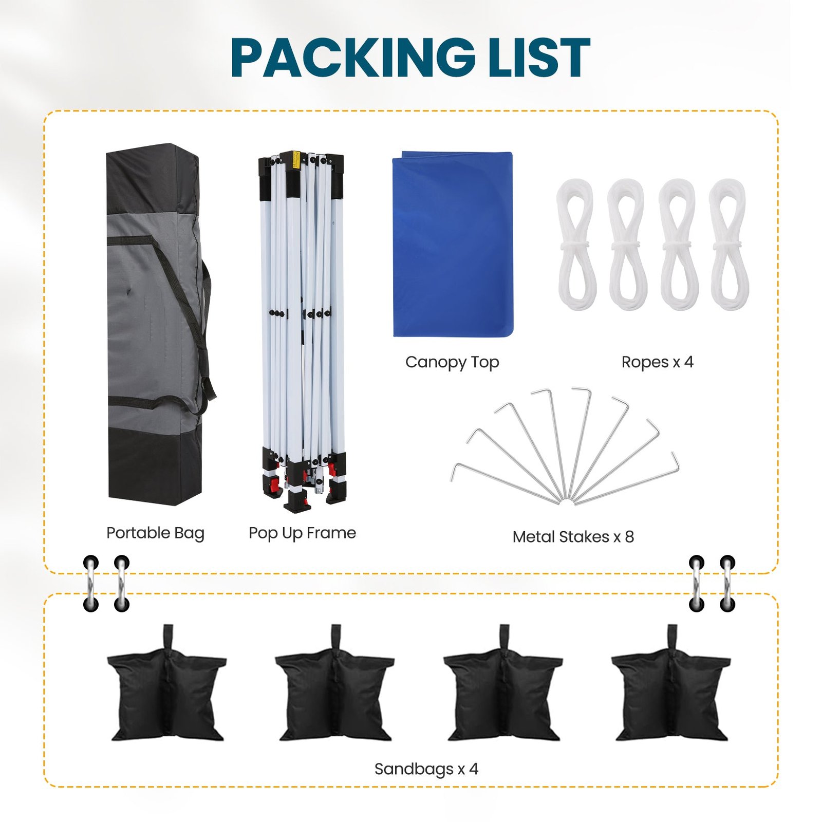 - Package Includes:1 straight leg canopy, 4 weight bags, 4 stakes, 4 ropes, and 1 instruction manual. Compact enough for easy transport to tailgates, the beach, the park, or wherever your adventure takes you.