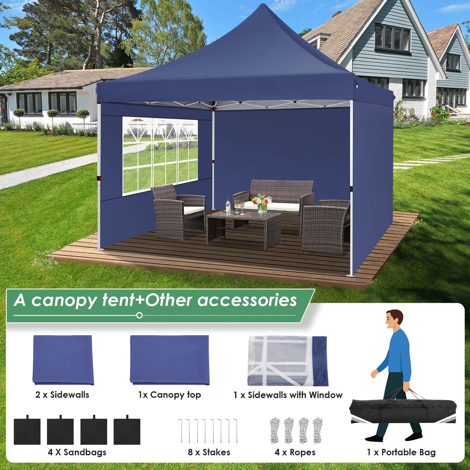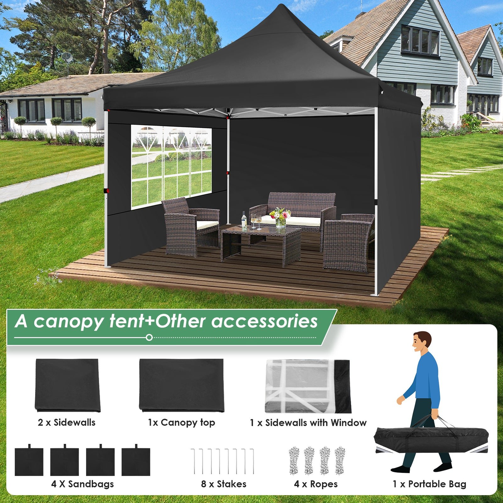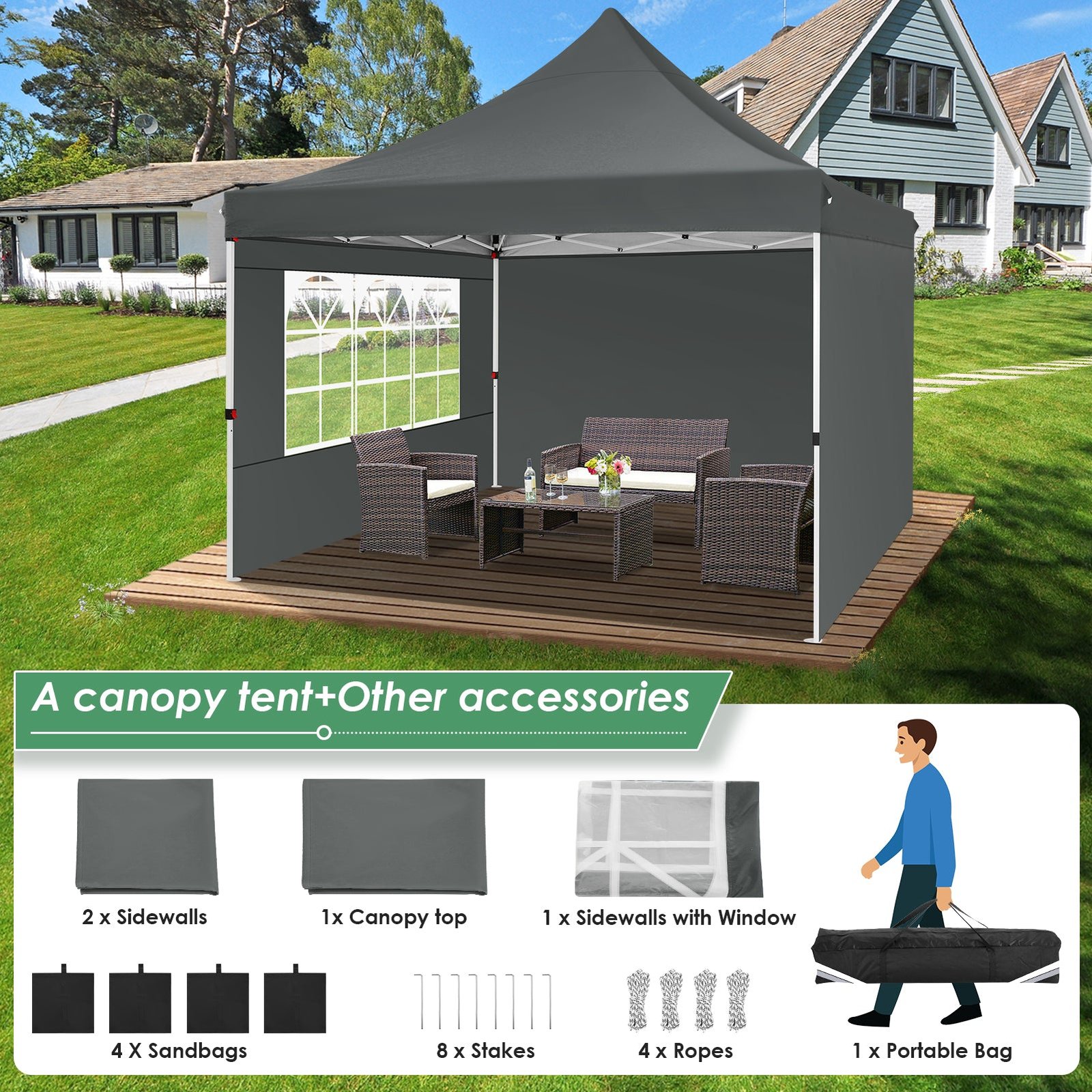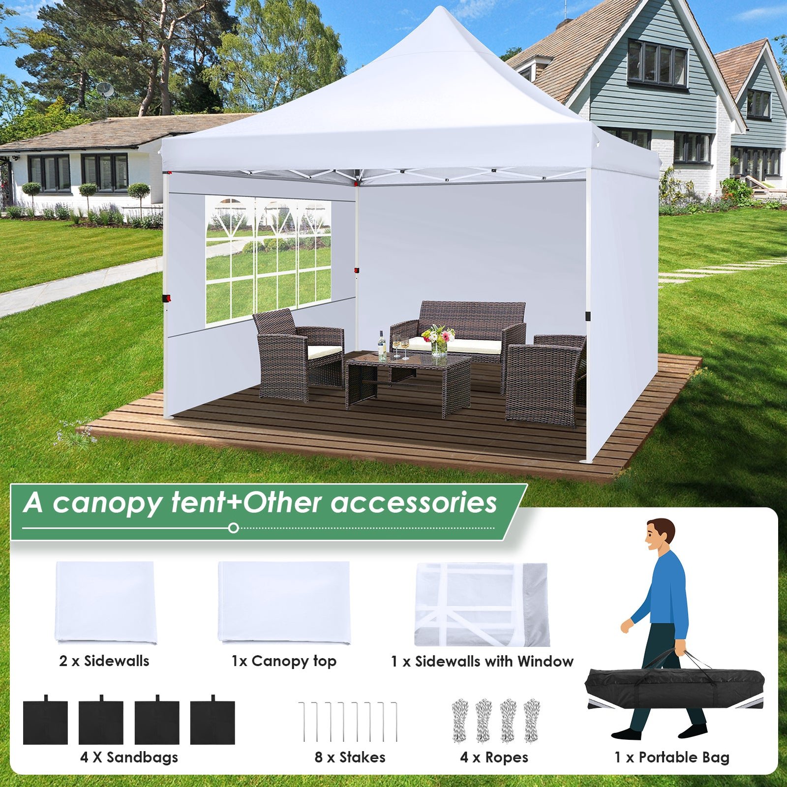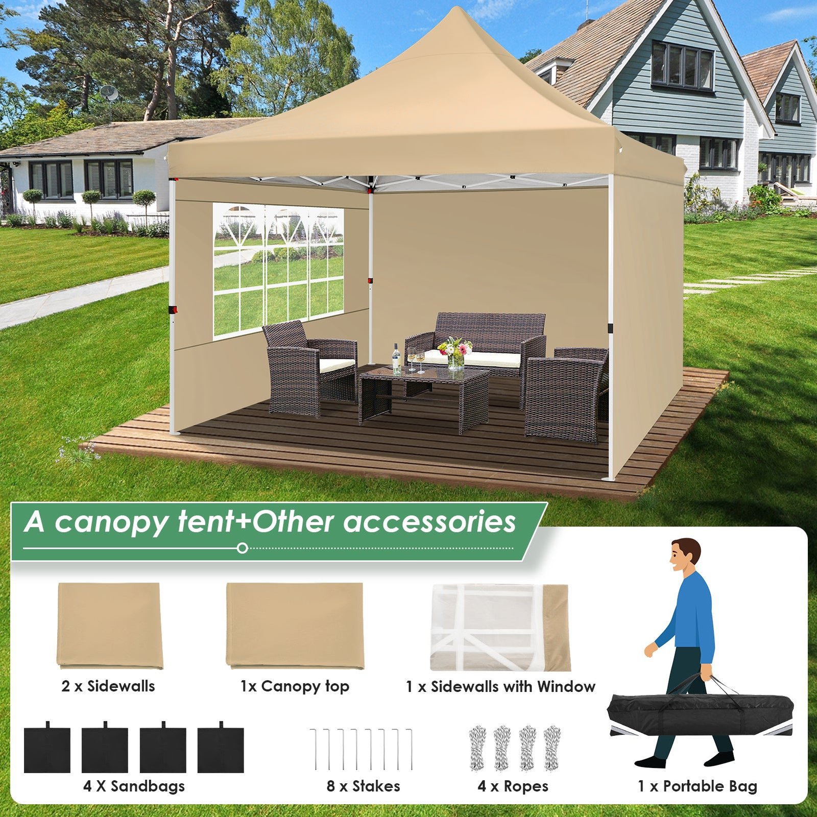 - 【Package Listing】1 x 10×10 heavy duty canopy frame, 1 x 10×10 Canopy Top Cover, 1 x Window Sidewall, 2 x General Sidewalls, 4 x Wind Ropes, 8 x Ground Pegs, 1 x 600D oxford cloth carrying Bag, 4 x sandbags, 1 x Manual. The 10×10 canopy tent is come with 3-year warranty, If you have any questions and doubts, please feel free to contact us.