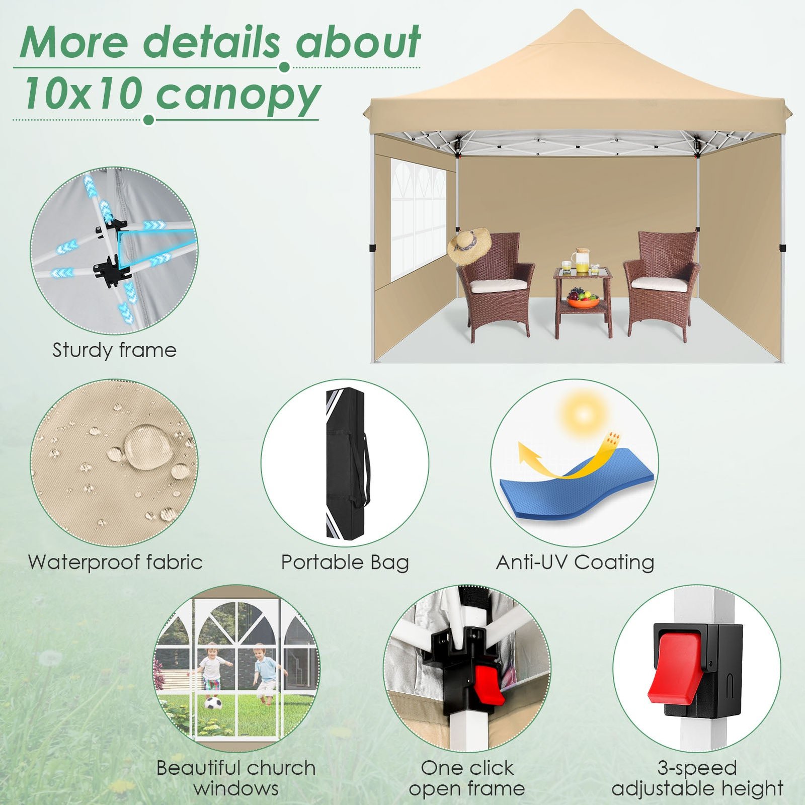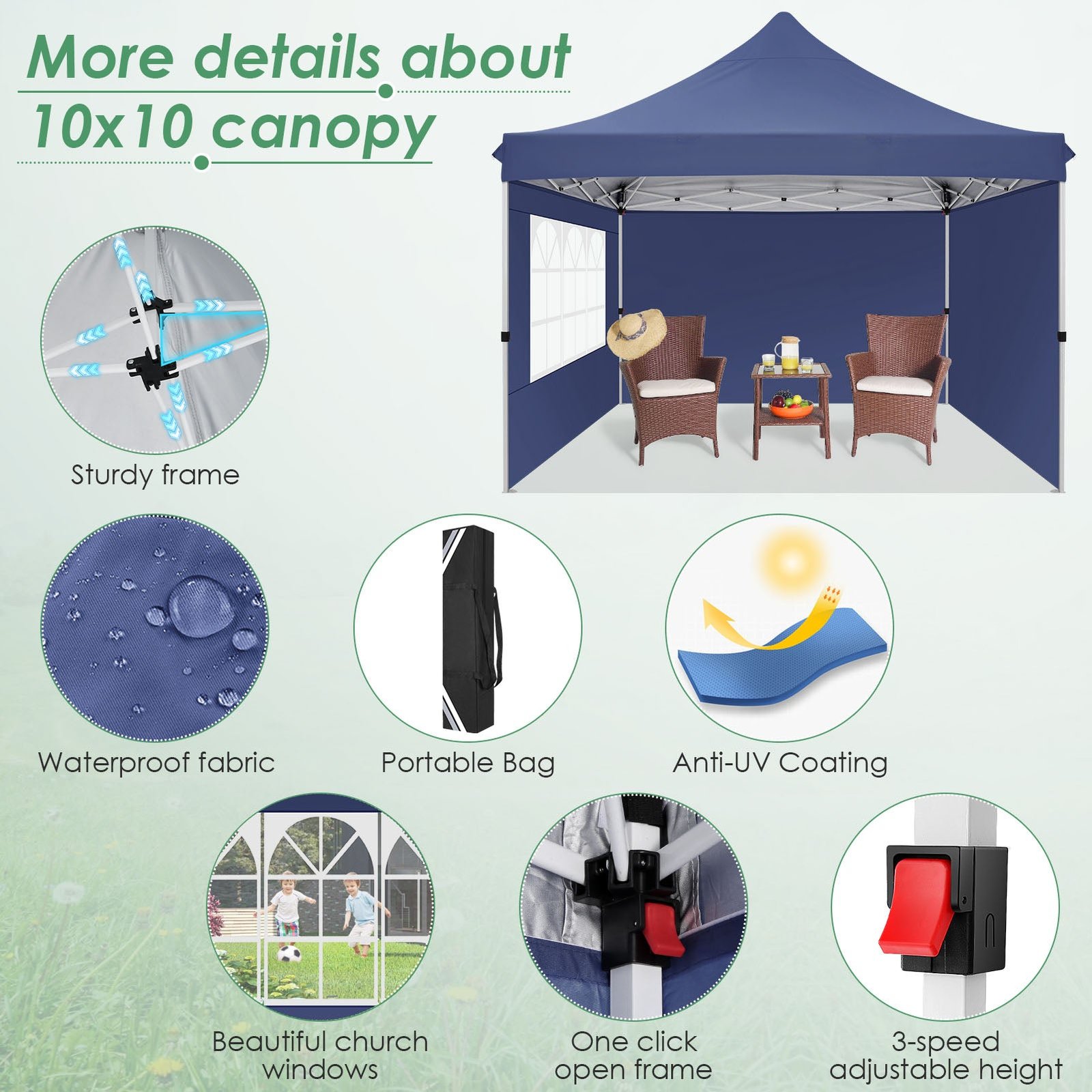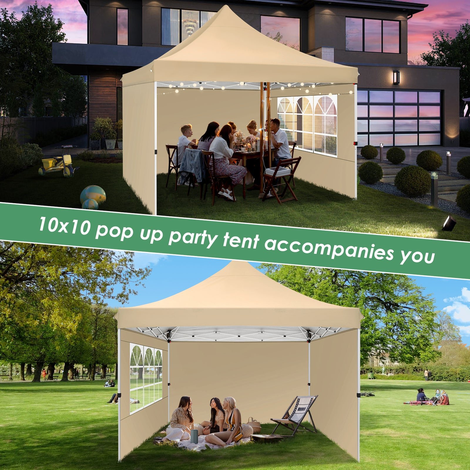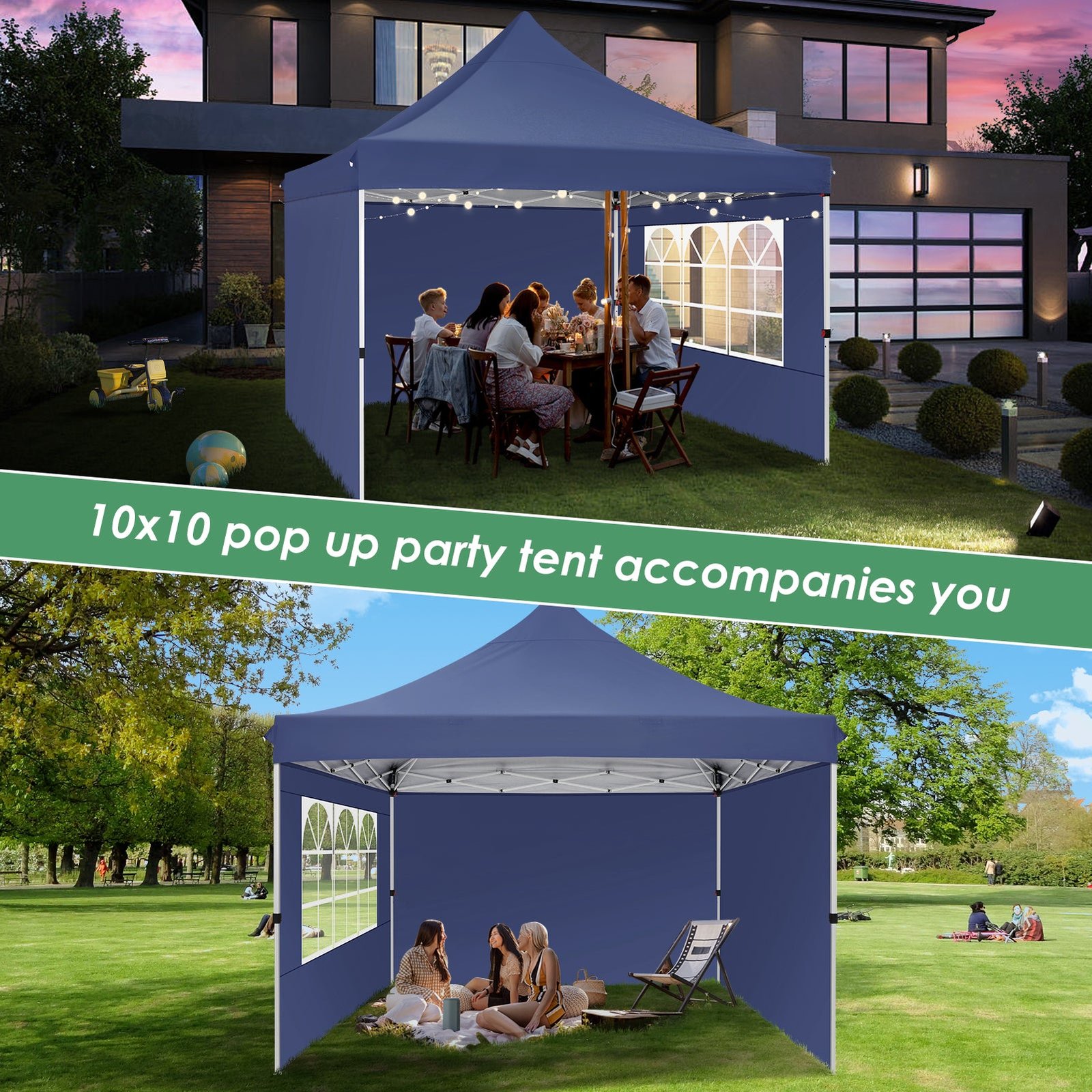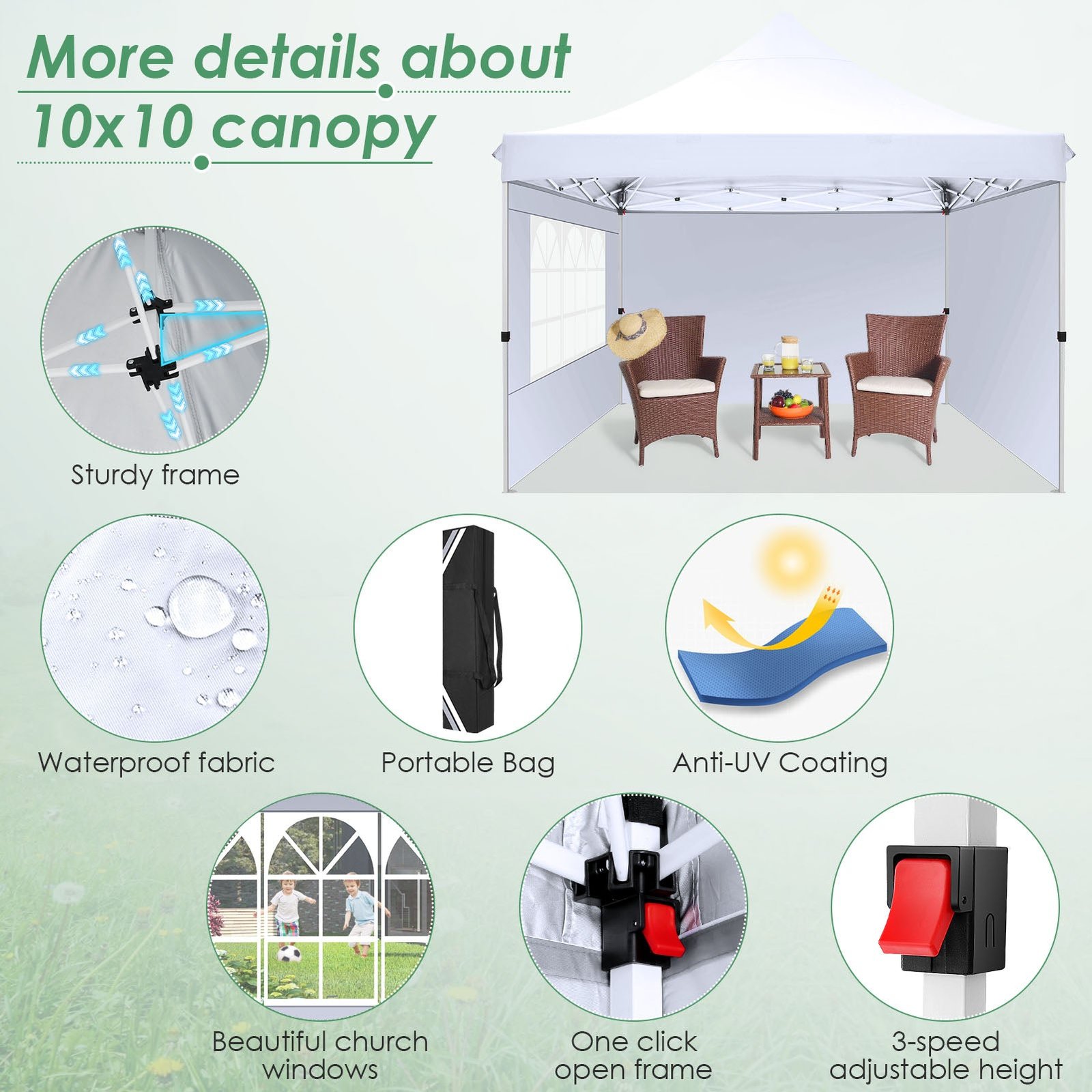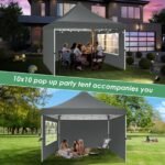 - 【UV Protection Removable Sidewalls with Zippers】Canopy tent 10×10 is made of high quality 210D Oxford cloth (95g) silver plated fabric that blocks 99% of the sun’s rays, effectively protecting the skin from sunburn. 10×10 canopy party tent with 1 window sidewalls and 2 general walls. You can set up gazebo tent with one without side walls in summer or all side walls in winter.