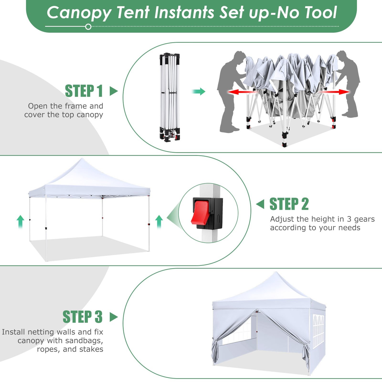- 【Quick & Easy to Set up & Take Down】10×10 ez up canopy only take one people to set it up in minutes, It is easy to install without any tools. The outdoor canopy with detailed installation videos and manual, You can adjust heavy duty canopy in 3 different heights (116″ / 120″ / 124″) with thumb button, allowing you to adjust the height easily according to your needs.