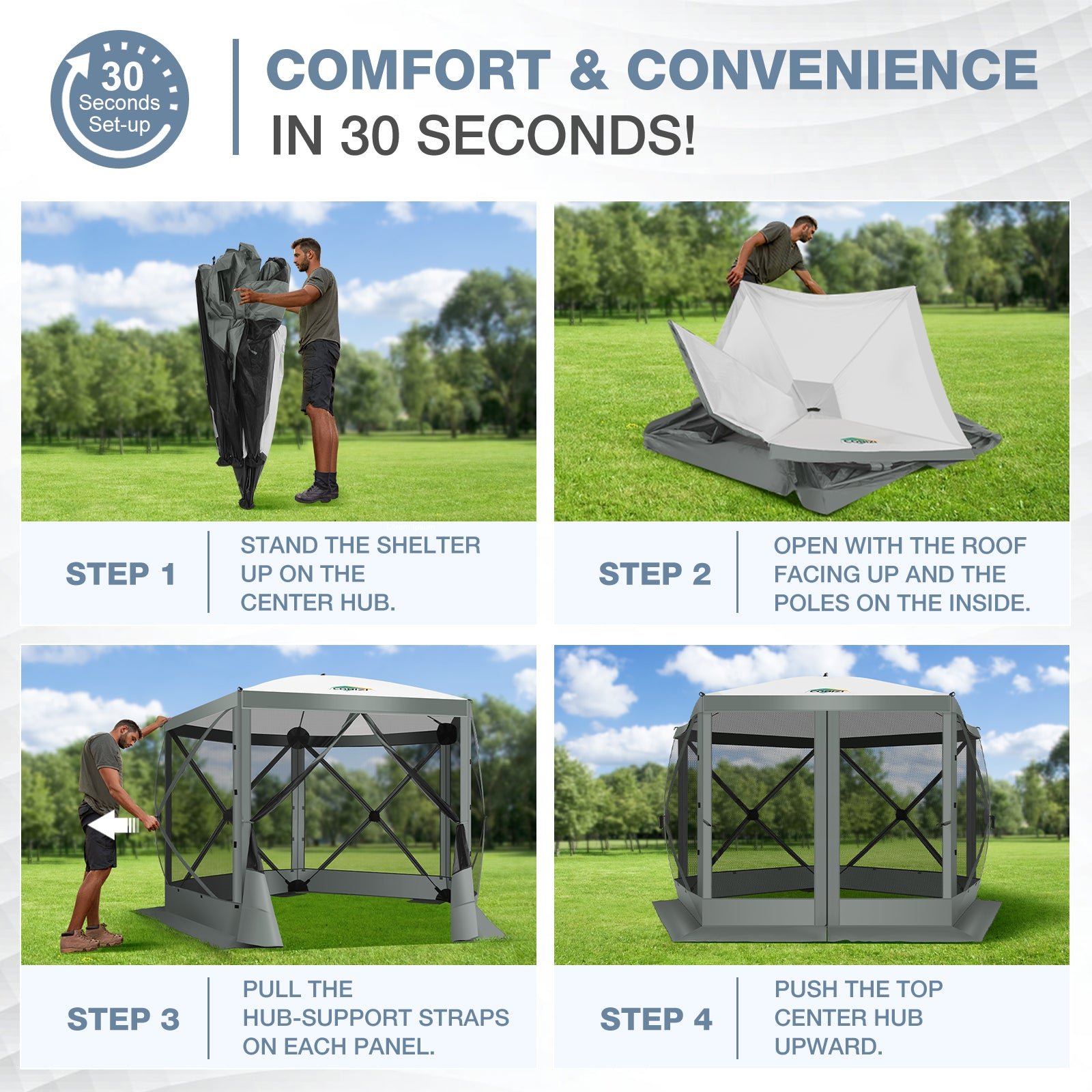 Spacious and Comfortable — This 10 x 10-foot screen tent for camping has plenty of room for up to 8 people and furniture, with a high ceiling that provides ample headroom. This screened in canopy with hub design Pop-up structure frame, very easy to set up and take down in 40 seconds.