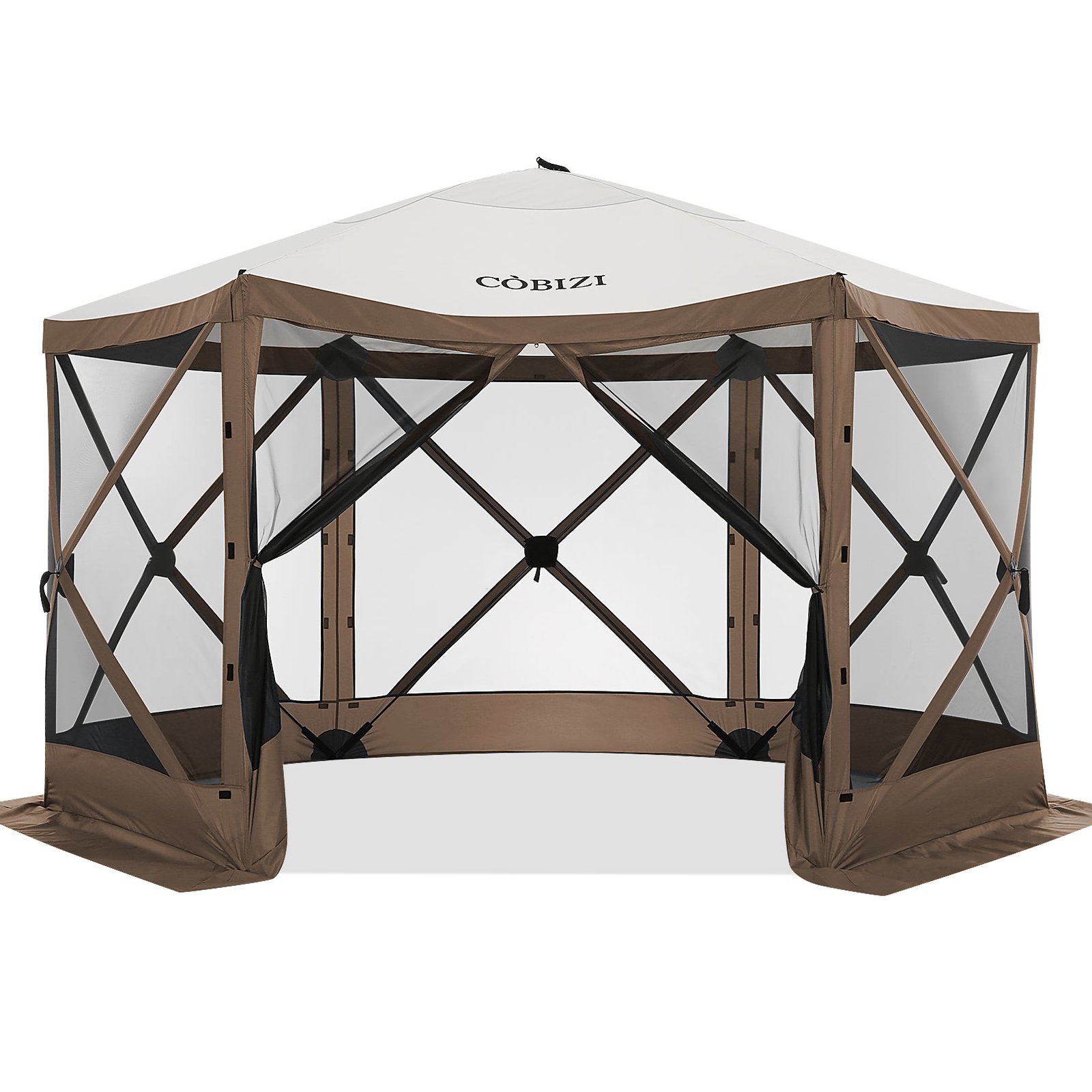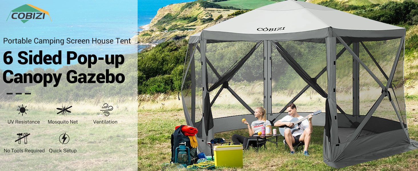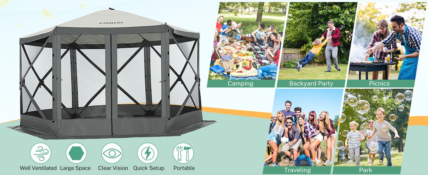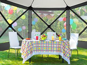 Mesh Screened — The hexagonal pop up tent is screened to keep unwanted elements away and let fresh air & light in. With aprons and gazebo skirts on all sides, it offers bug-free protection.