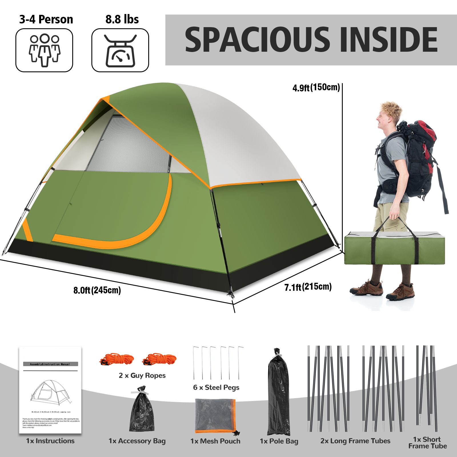 【Compact Yet Spacious】Despite its lightweight design (8.8 lbs) and small packed size (18x7x7 inches), the tent expands to a roomy 96 x 84 x 59 inches, comfortably accommodating 4 sleeping bags.