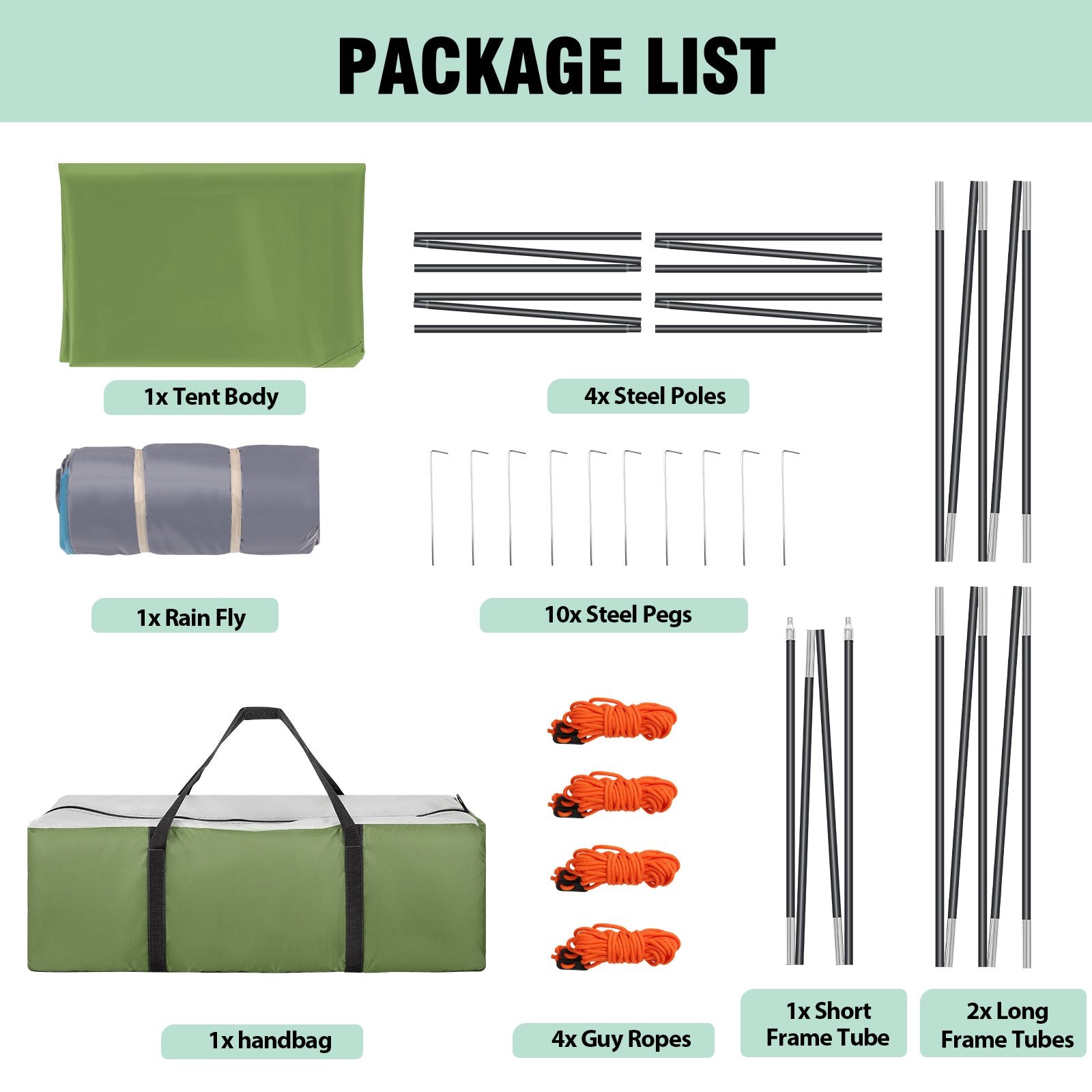 【Compact Yet Spacious】Despite its lightweight design (8.8 lbs) and small packed size (18x7x7 inches), the tent expands to a roomy 96 x 84 x 59 inches, comfortably accommodating 4 sleeping bags.