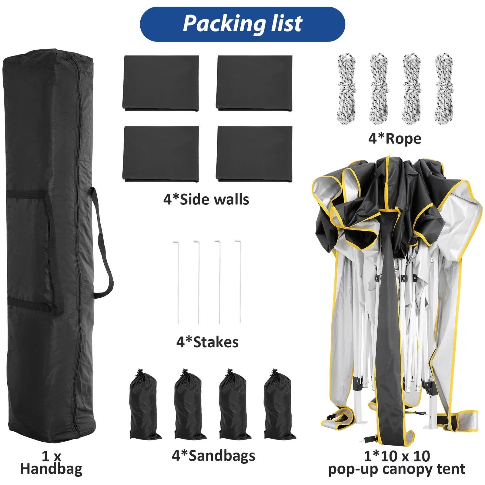 🔹【Package Contents & Customer Service】The package includes a 10×10 pop-up canopy tent, four sidewalls, a carrying bag, four stakes, four ropes, and four sandbags. If you have any questions or concerns, please feel free to contact us. We are dedicated to providing exceptional customer service and assistance.