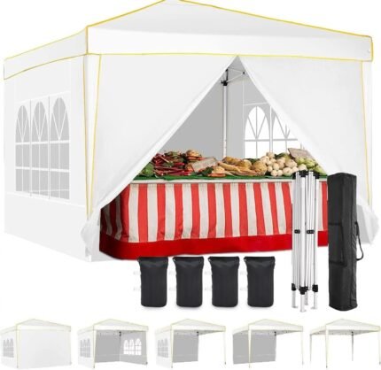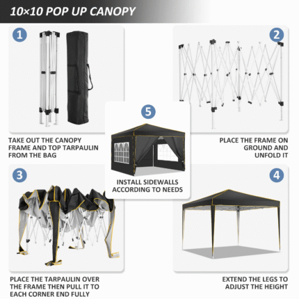 The 10 x 10 Ft canopy tent is constructed with a one-step setup steel tent frame, waterproof canopy top, 4